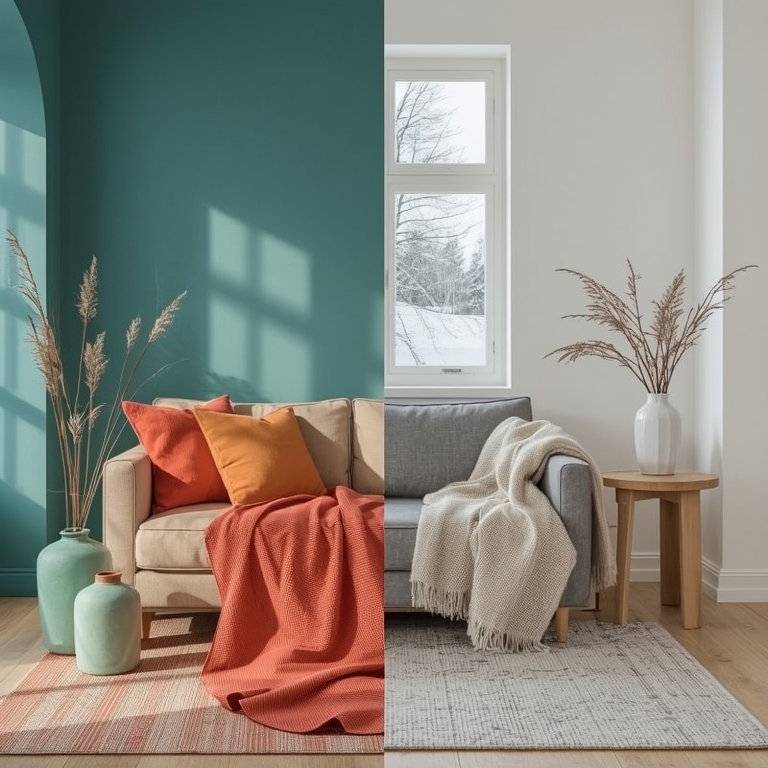 - eklektyczny detal: neutralna baza 60%, dywan z wzorem 30%, jedno niebieskie krzesło jako kontrast 10%.